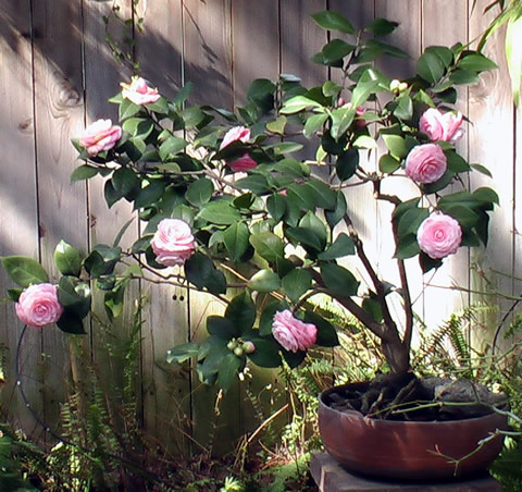 The Pink Camellia Bonsai will be 20 years old this spring. So pretty right now, basking in the light. We had the trees trimmed in February so it will be getting more sunlight this summer than it has for the past few years. Hope it likes the change.
