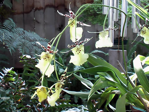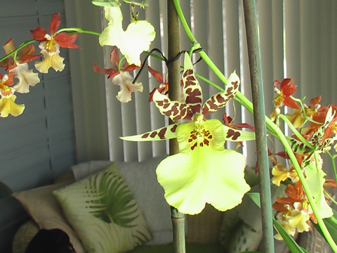 The Oncidium family is very large and includes many flower varieties. The most common flower variety is often referred to as the “dancing lady”. These Oncidium types have thin leaves, pseudobulbs, and branching sprays with flowers colored in yellow and mahogany. (thanks OrchidWeb.com)