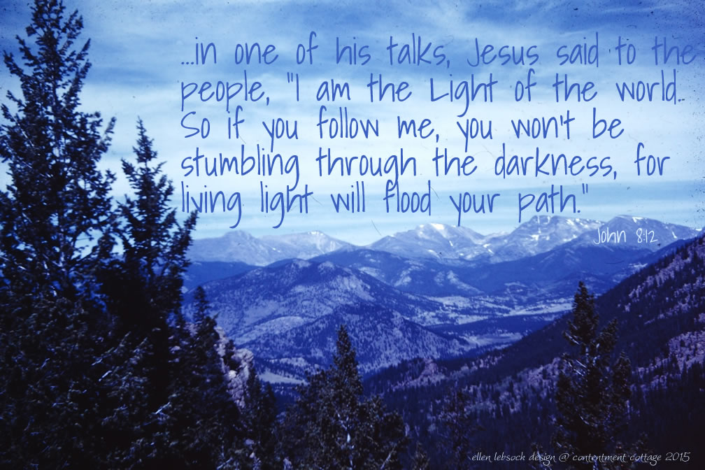 Jesus once again addressed them: “I am the world’s Light. No one who follows me stumbles around in the darkness. I provide plenty of light to live in.”