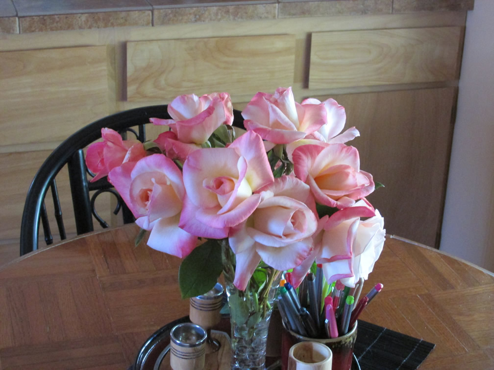 This morning I wanted to share my bouquet of Gemini Roses gracing our breakfast table with you. So lovely. Such a special treat to have Dick bring them fresh from the garden — a treat that will happen almost daily until the heat of mid-summer slows their blooming. The glorious roses that were planted in the early spring are beginning to bless us with their first flowers, too.