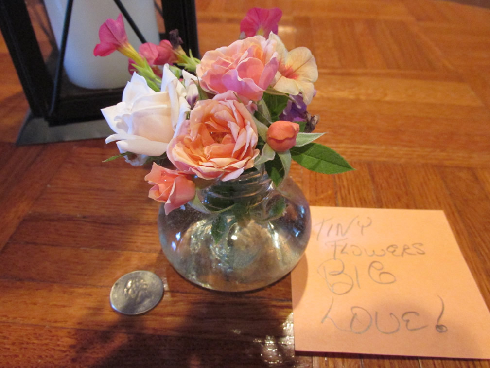 Although all of our roses, perennials and annuals are great performers outside, many are gathered for lush beautiful bouquets to brighten the cottage with color and wonderful fragrance. From spring through fall and into early winter, hardly a day goes by that Dick and Kai Li don’t return from the garden by greeting me with a joyous, “Mom! Oh Mom!” Dick holds the flowers of the day behind his back and Kai runs to tell me something special is going to happen. Sometimes the bouquet is huge, like the one above. Other times, when only a few flowers are in bloom, it is tiny. But it is always an offering of LOVE.
