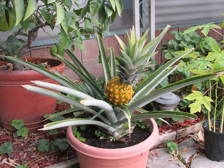 First it produced a fruit, and now there is a baby plant coming up beside the original. That means we’ll have another “candy-sweet” home grown pineapple next summer ![]()