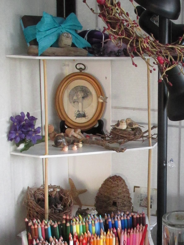 I wasn’t sure exactly where they were gonna live, outside of hiding, then one day last week I read a post on Facebook by a British artist I enjoy following. She put up some photos of her work space that included “an inspiration shelf that houses all my very most favourite things.”