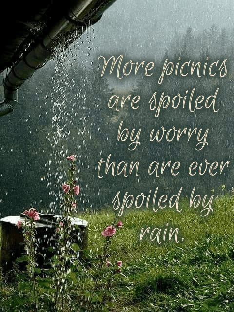 On this 4th of July eve I am reminded of a lifetime of celebrations. There have been picnics and parties, camping trips with friends, silent solitary times and fireworks. I can recall celebrations in the Colorado mountains, on the Pacific Coast, and on a houseboat moored on the Lake of the Ozarks. Some were so much fun. Some were so not fun. Sometimes the sun blazed down on the celebration. And, sometimes the rain poured down. But this much experience has taught me: “More picnics, parties and camping trips are spoiled by worry than are ever spoiled by rain!”