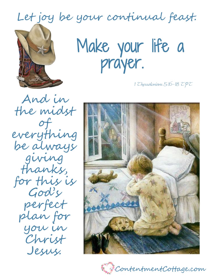 The footnotes say, “1 Thessalonians 5 Verses 16–18 identify three areas our lives we must focus on: (1) unbounded joy, (2) praying continually, and (3) giving thanks to God no matter happens in our lives. These three virtues combine to form the wonderful expression of Christ’s life within us.”