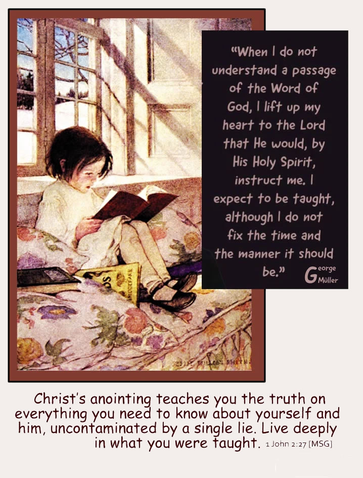 26-27 I’ve written to warn you about those who are trying to deceive you. But they’re no match for what is embedded deeply within you—Christ’s anointing, no less! You don’t need any of their so-called teaching. Christ’s anointing teaches you the truth on everything you need to know about yourself and him, uncontaminated by a single lie. Live deeply in what you were taught. 28 And now, children, stay with Christ. Live deeply in Christ. Then we’ll be ready for him when he appears, ready to receive him with open arms, with no cause for red-faced guilt or lame excuses when he arrives.