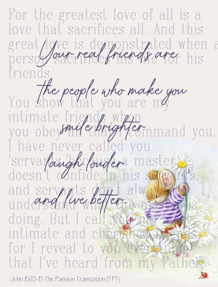 “I’ve told you these things for a purpose: that my joy might be your joy, and your joy wholly mature. This is my command: Love one another the way I loved you. This is the very best way to love. Put your life on the line for your friends. You are my friends when you do the things I command you. I’m no longer calling you servants because servants don’t understand what their master is thinking and planning. No, I’ve named you friends because I’ve let you in on everything I’ve heard from the Father.
