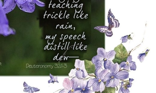 Grace and peace on you today Dear Hearts I love this passage from The Song of Moses “Give ear, O heavens, and I will speak!Let the earth hear the words of my mouth. May my teaching trickle like rain,my speech distill like dew— like gentle rain on new grass, like showers on tender plants.For I… Continue reading Deuteronomy 32:1-3