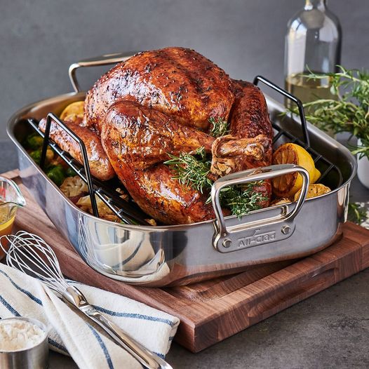- Place the roasting pan in the hot oven and let the chicken cook undisturbed for about 1 hour and 15 minutes or until an instant read thermometer inserted into the breast (not touching any bones) registers about 160°F and the skin is the color of burnished gold.