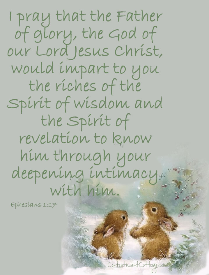 Today I am reminded of Paul’s prayer for the church in Ephesus. He asked God to impart (verb: to transmit knowledge of) the riches of the Spirit of Wisdom and the Spirit of Revelation so that you and I could deepen our intimacy with Jesus.
