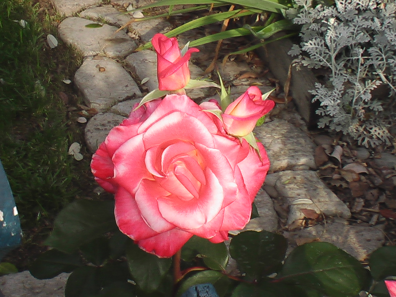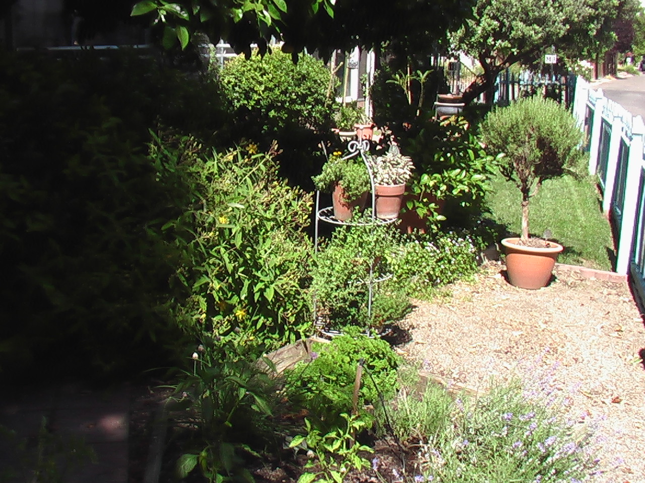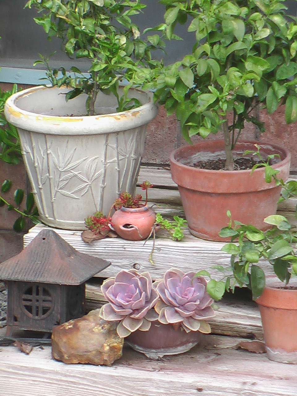 Our collection of succulents thrive in the magnified heat of this tiny desert space, blooming profusely in the bright sunlight. This collection of terracotta pots form the birdbath, setting the tone for the theme of container gardening found throughout our tiny yard. Specimen plants in well worn terracotta pots are placed at intervals throughout with traditional plantings around every corner.