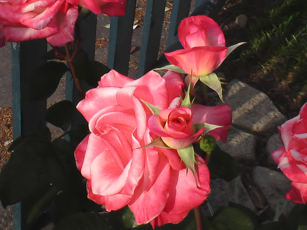 Moving north, into the shade of the heavily laden grapefruit tree, and looking back into the sunshine beyond the fence, tomatoes and marigolds suspended in bamboo tepees bridge the path between the four-square beds and another raised rectangle, this time filled with roses, bordering the lawn. In this small garden, space is maximized by using every trick of doubling and layering we can think of.