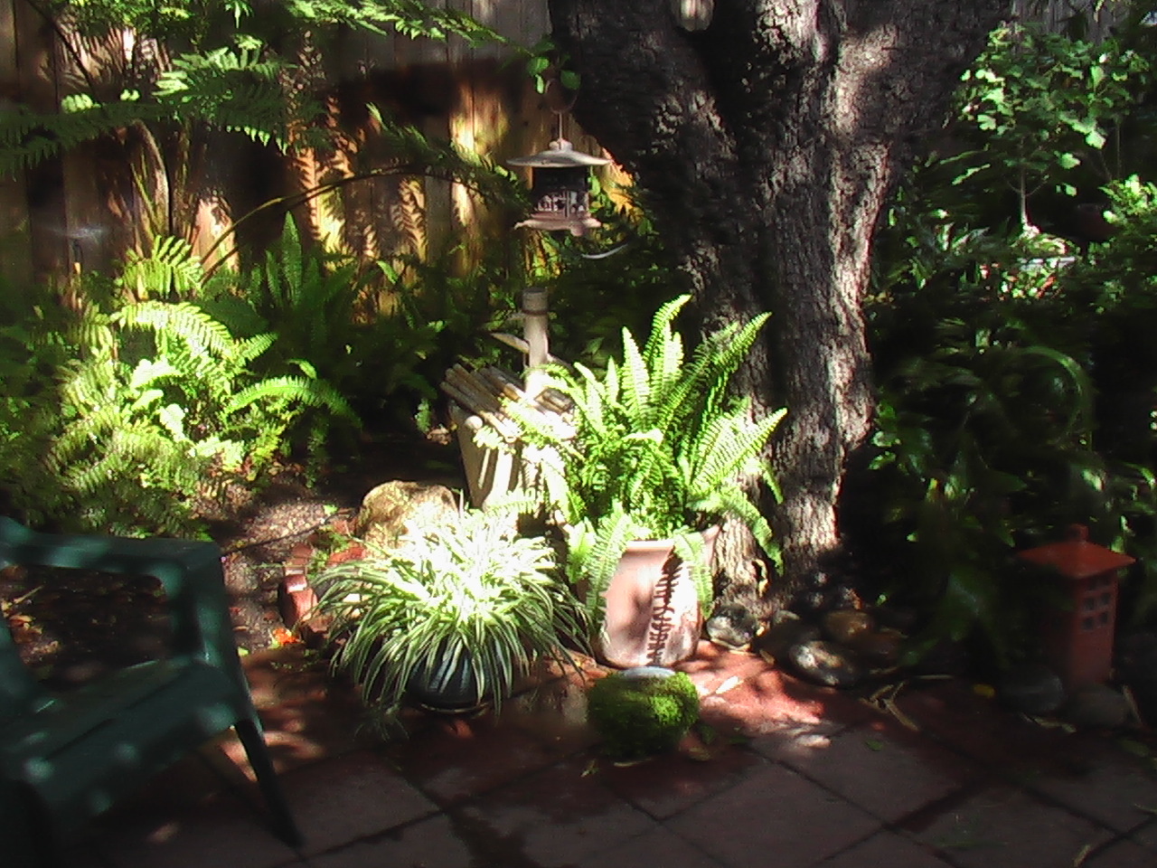 Early morning light washes across the garden, bathing the small patio and new plantings in gold. This photo captures a tapestry of leaf shapes and textures, sunlight and shadows. One of the most satisfying things about the way we garden is the ever changing beauty of each small patch of scenery.