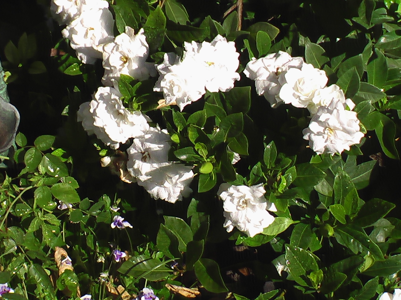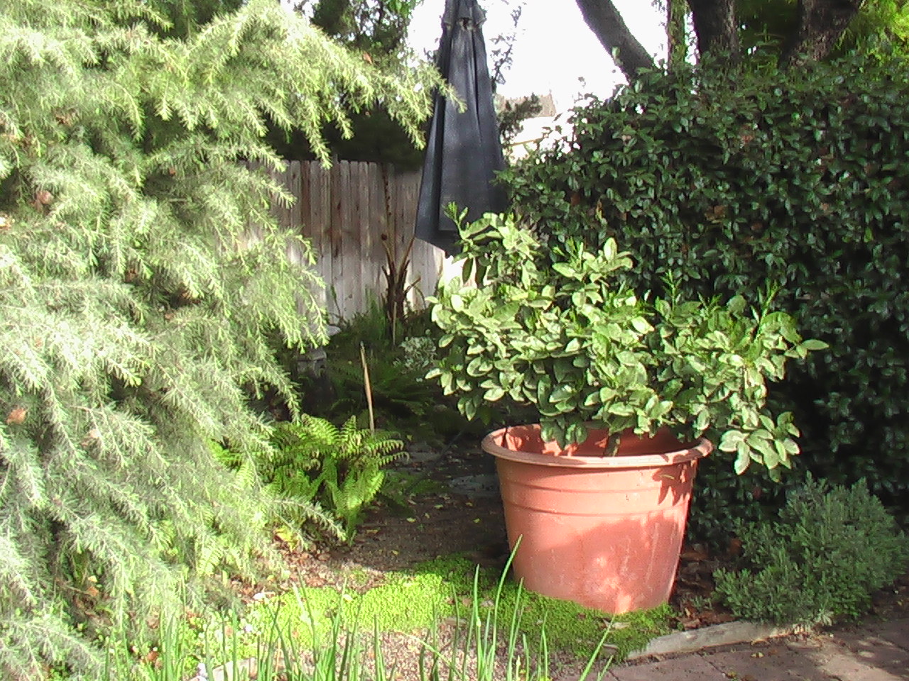 Thanks to our Zone 9 climate we are able to grow both traditional garden varieties and semitropical plants with equal success. The cottage is flanked on the south with a guava and a pomegranate; on the east with two huge pots. One contains a Meyer lemon the other a navel orange.