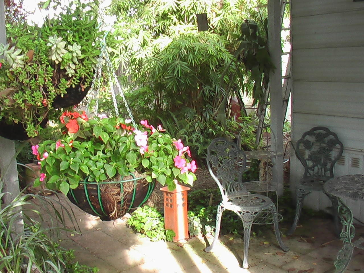 Moving into the shade beyond the herb garden our garden guests find a couple of comfy chairs and a small table, usually graced by a plant in full seasonal blossom.