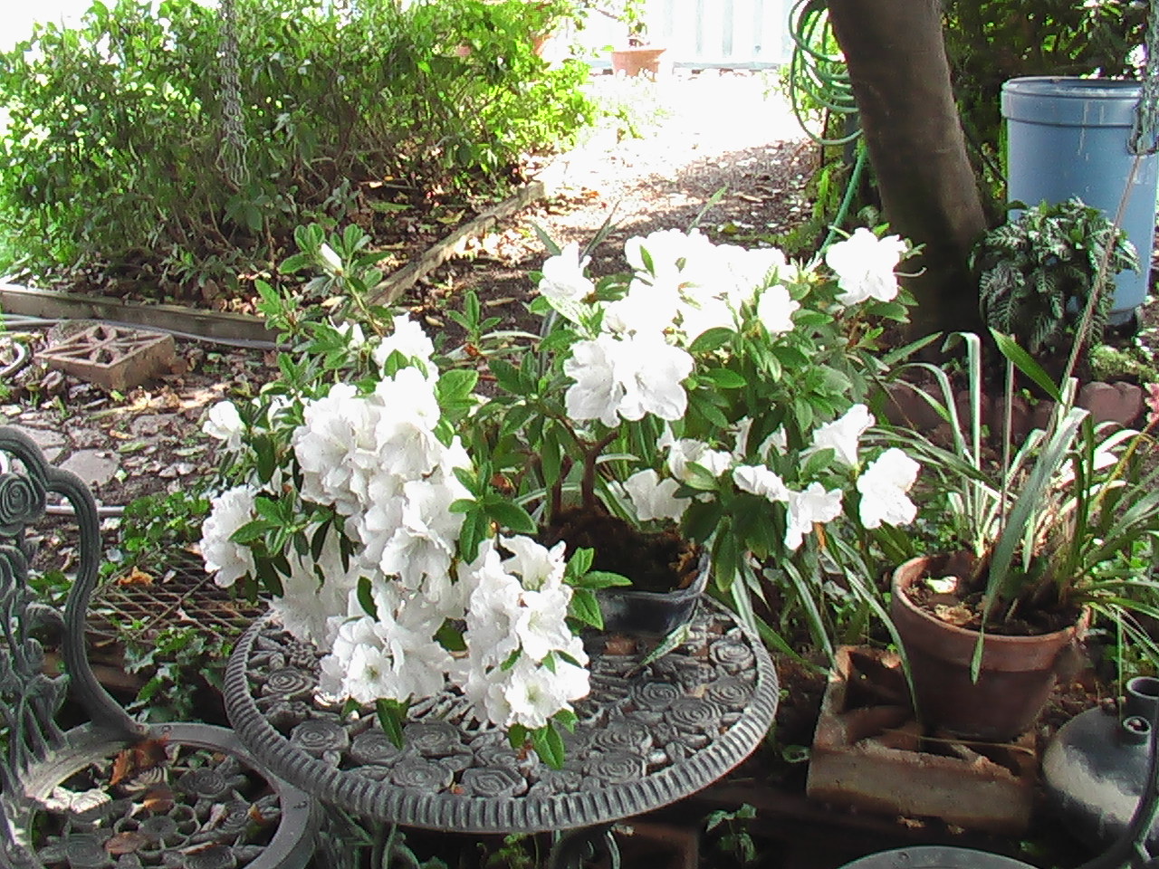 Somewhere in this garden you can always find a spot perfect for taking a few moments away from any task. I love it… morning, noon or evening! It’s difficult to remember when there were only weeds and a a few neglected patches of lawn under these trees… but sure enough, when we moved to the cottage in 1996 that’s exactly what we faced. Here’s where I pause to give credit where credit is due. Dick moved every pebble and paver, dug the fish pond and planted most of what you’re seeing. My share of the gardening comes in much smaller projects. I care for the herbs, water the containers, sweep the paths and enjoy, enjoy, enjoy! There must be about four or five trucks full of top-soil, pea-gravel and pavers in this small paradise. I’m thankful for each and every inch of it, and I acknowledge every ache and pain Mr. L earned making it so.o.o. beautiful.