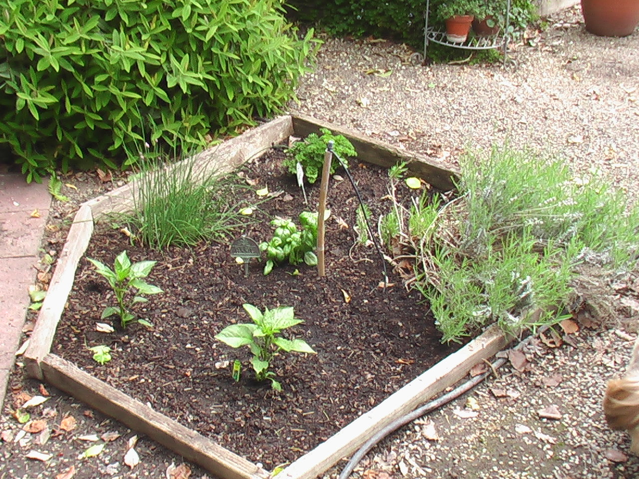 A step inside the Garden Gate brings you to our version of a four-square herb garden. The beds are filled to the depth of a two-by-six and centered on a brick-paved patio. Closely planted with culinary herbs and interspersed with seasonal vegetables. It’s small. Each bed is only about eight square feet; but it yields enough tomatoes, peppers and eggplant to freeze sauces and share the abundance with neighbors.
